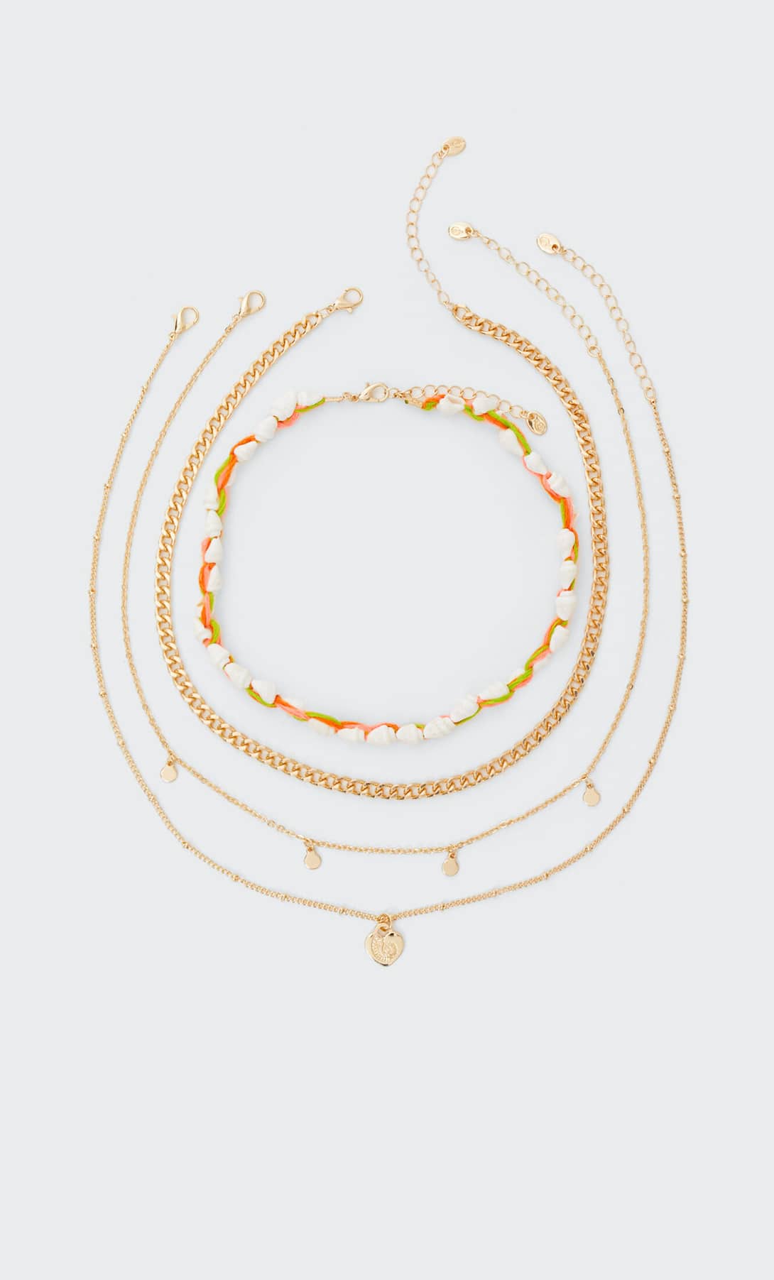 Incluye un collar con colgante en forma de corazón dentro del que se aprecia una concha. Un collar con pequeños colgantes, una cadena de estilo clásico y una gargantilla con conchas. Así tienes un collar para cada ocasión.