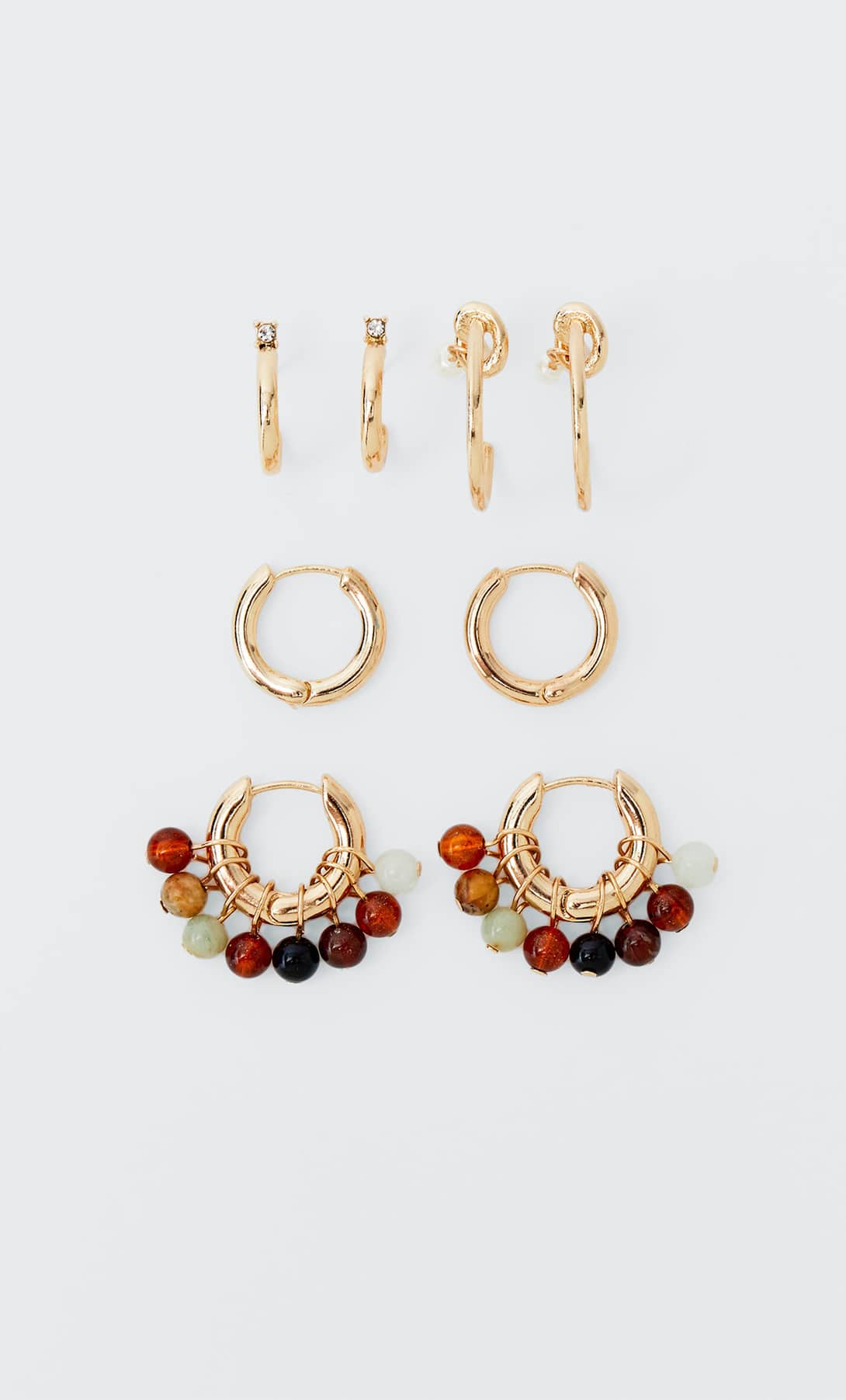 Este set está compuesto de cuatro pares diferentes de pendientes de aro en color dorado. Destacando especialmente el modelo que incluye charms de colores en forma de pequeña bola.