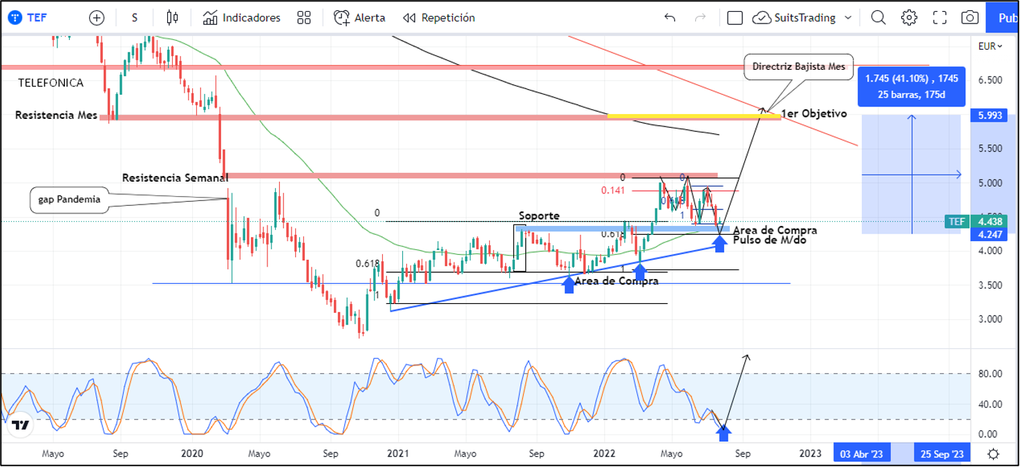 Es por esto, por lo que, desde meses atrás, incluido el pasado 12 de julio, graficamos un potencial retroceso en las acciones de Telefónica, el cual se ha venido desarrollando de acuerdo con nuestro análisis y que, al mismo tiempo, nos da oportunidad latente de compra en inmediaciones de 4,25 euros, donde confluyen el pulso del mercado con el soporte semanal más importante, registrado en agosto de 2021 y la media móvil exponencial de 50 periodos.