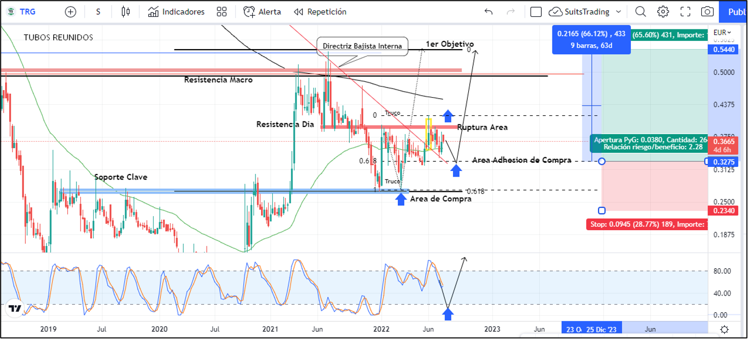 Si retomamos el artículo presentado el pasado 10 de marzo, podemos encontrar que, desde los niveles de ingreso en compras sobre los 0,274 euros, la acción de Tubos Reunidos se ha revalorizado más de un 30%, sin lograr realizar la ruptura sólida de la resistencia diaria que corresponde a niveles de 0,40 euros que ubicamos para la semana del 21 de junio del año pasado.