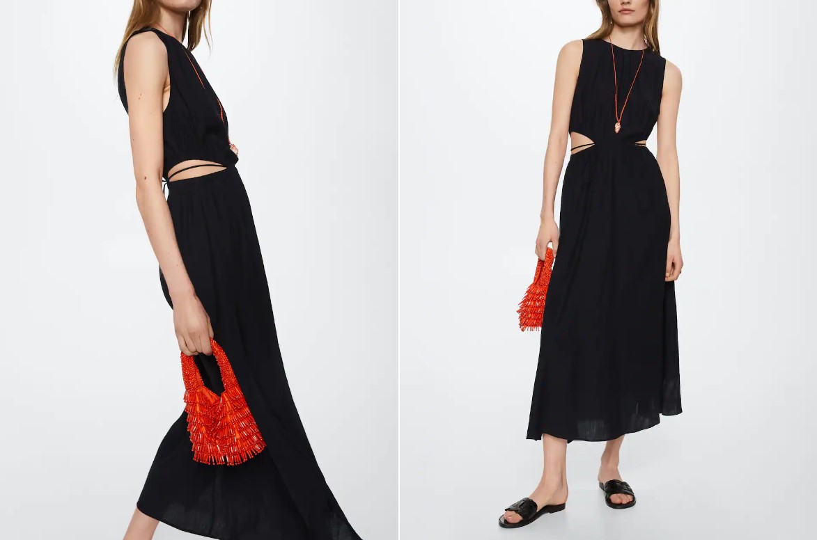 Para finalizar vimos esta otra opción de vestido negro de Mango muy versátil, práctico y favorecedor. Su diseño es cut-out, largo y recto, con cuello redondo y sin mangas. Tiene detalles fruncidos, con cierre de lazo en la parte posterior. Está disponible Plus. Pertenece a la Colección Committed y el tejido es muy fluido, compuesto por 85% viscosa y 15% poliamida. Su precio es de 39,99 euros.