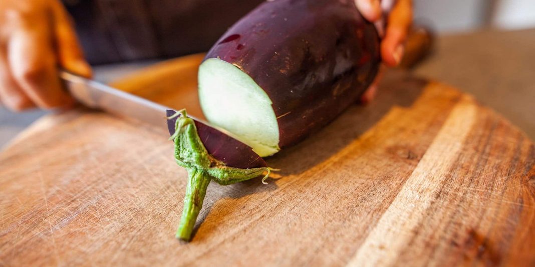 Para comenzar esta receta tenemos que cortar las berenjenas. Es importante que la verdura tenga un tamaño medio para que nuestros paninis queden más grandes y nos quite el hambre. Para ello, cogeremos la berenjena y realizaremos unos cortes en forma de láminas de unos 2 centímetros de grosor, para que nuestra base de los paninis no nos quede muy fina y parezcan más chips de berenjenas que paninis.