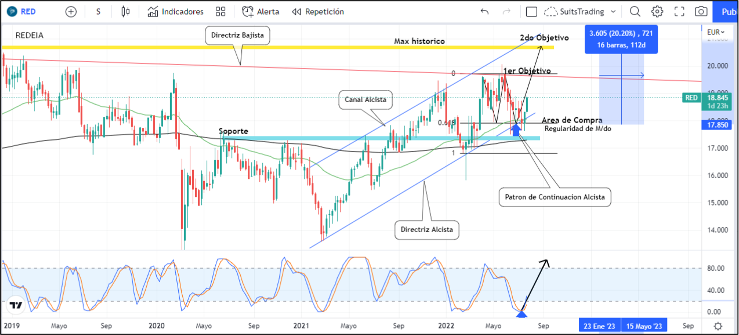 Es importante remarcar la estructura que el precio ha realizado visitando y respetando un área de soporte en inmediaciones de los 17,5 euros desde los cuales se ha apoyado en más de tres ocasiones donde confluyen el soporte con el área de regularidad del mercado en el 61,8 retroceso de Fibonacci del último avance, más, la media móvil exponencial de 50 periodos y claro está, el nivel inferior del canal alcista. Por esta razón hemos venido comprando desde los 17,9 euros con dos objetivos claros establecidos.