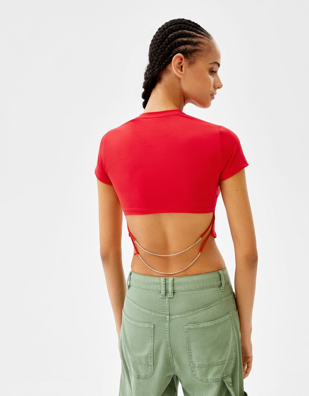 Porque en la espalda nos encontramos con dos originales cadenas de strass que convierten una sencilla camiseta en una prenda mucho más sofisticada.