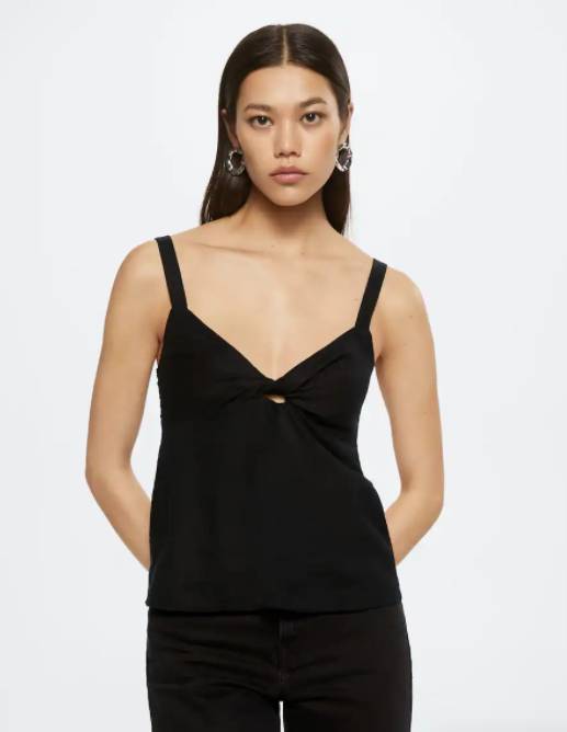 Se trata de un top confeccionado en tejido mezcla de lino, con un efecto muy fluido y diseño recto. Destaca su detalle de nudo en la zona media de la prenda con detalle de abertura. Rematado con escote de pico y tirantes finos.