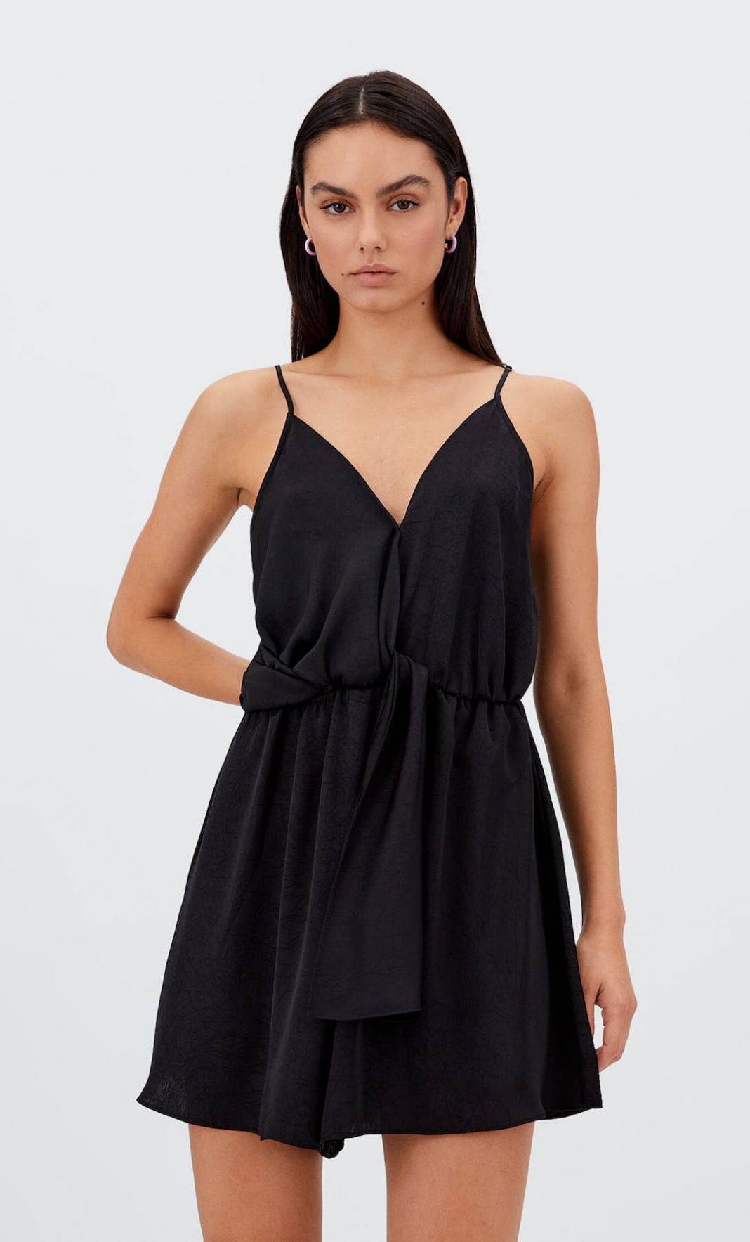 Es un mono corto con escote de pico y tirantes finos regulables en altura, con pantalón corto y ancho que produce efecto falda. Rematado con un nudo en la zona delantera.