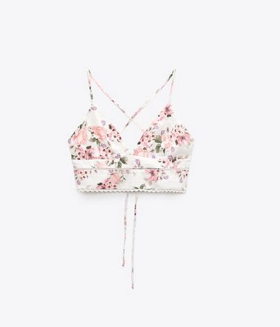 Los crop top son una de las tendencias que han arrasado con más fuerza este verano y podemos encontrar todo tipo de diseños para todas las ocasiones. Uno de los más ideales de la nueva colección es este modelo con pequeñas rosas sobre fondo blanco, con un amplio escote en forma de pico y tirantes muy finos ajustables con lazada. Las cintas quedan cruzadas en la espalda, lo que le da un toque muy especial. Cierra detrás con ganchos metálicos y el precio es de 19,95€.