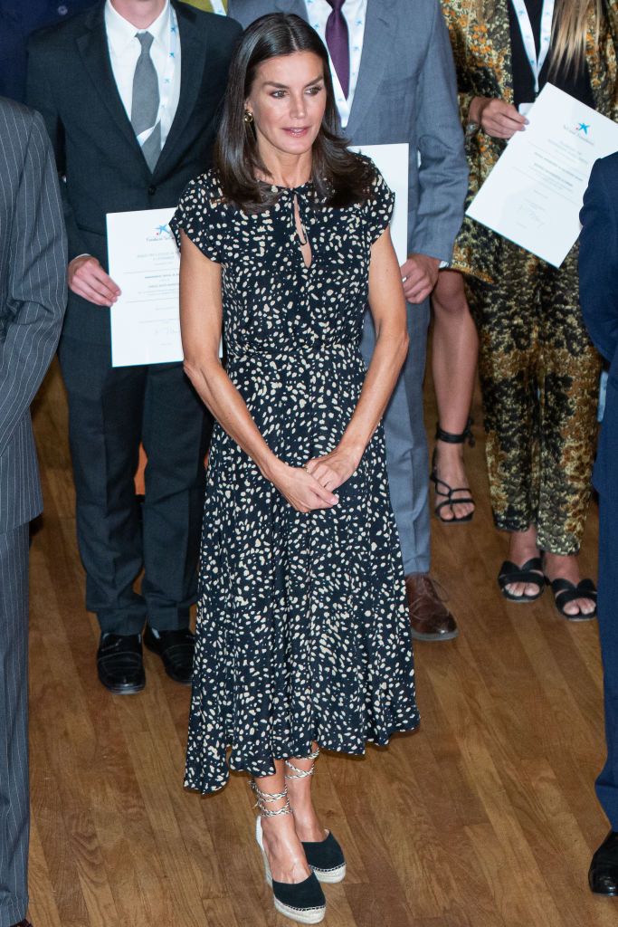 En la entrega de becas de la Fundación La Caixa de hace poco, la Reina llevó un vestido estampado. De la mano de Massimo Dutti, este vestido era de estilo midi, con manga corta, escote lágrima y cintura marcada.