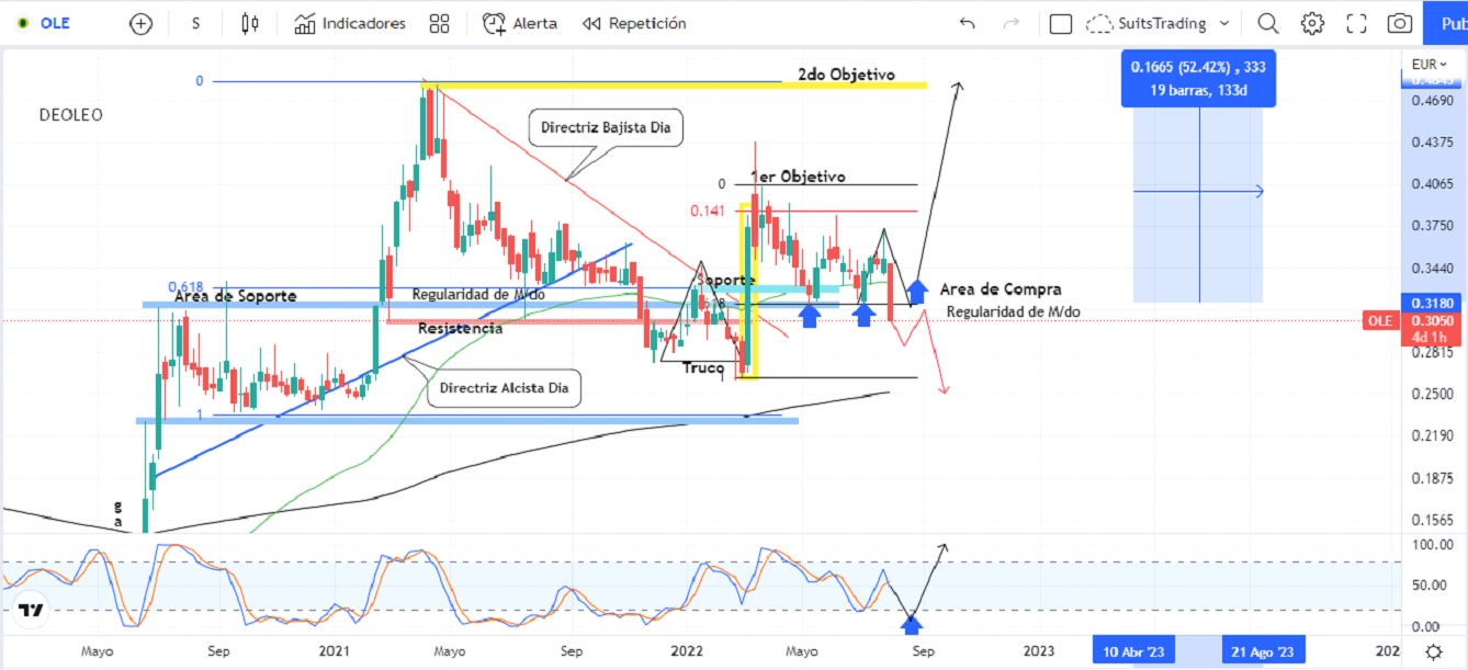 Si, por el contrario, el mercado se inunda de pánico y lastra el precio de Deoleo quebrando el área de regularidad del mercado con vela sólida semanal, seguramente buscará niveles de inicios de 2021 en inmediaciones de 0,2590 euros donde se ubica la base del truco desde donde comienza la estructura del patrón en confluencia con la media móvil exponencial de 250 periodos de largo plazo y muy posiblemente con un índice de fuerza relativa en niveles de sobreventa.