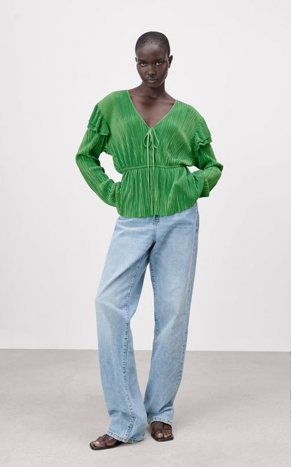 Si buscas una blusa plisada que sea bonita, elegante, cómoda y económica te recomendamos que te pases por cualquiera de las tiendas que Zara tiene repartidas a lo largo del país. Y todo porque esta que ves en la imagen tiene estas cuatro características. Además, tiene escote pico ajustable con lazadas que le dan mucha fuerza y personalidad. Su precio es de tan solo 3’99 euros.
