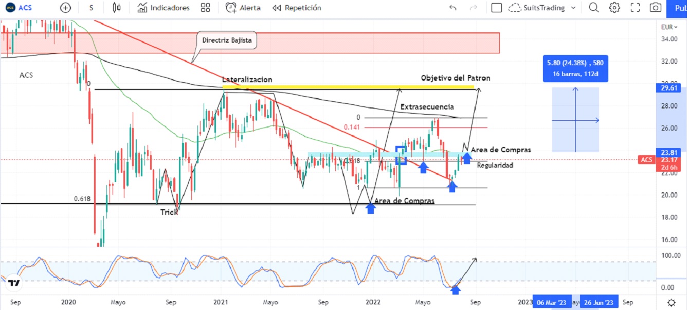 El precio ha desarrollado el rompimiento de la directriz bajista macro y luego de un retroceso de más del -20%, las acciones de ACS se impulsaron al alza nuevamente sobre la directriz bajista ubicándose nuevamente sobre la regularidad del mercado, es decir, sobre los 23 euros.