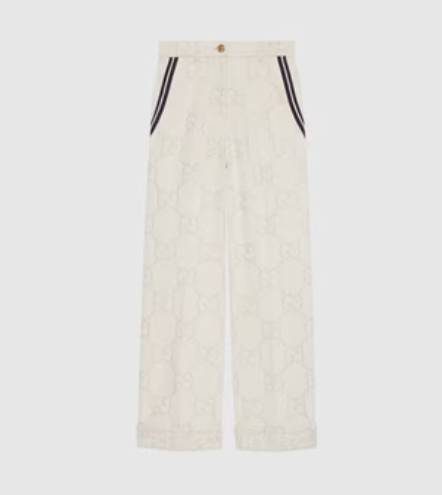 En Gucci se atreven con todo, y no es extraño encontrar en sus colecciones prendas aptas para las más atrevidas. Como este original pantalón de algodón con estampado jacquard con maxi GG y etiqueta de piel con GG.