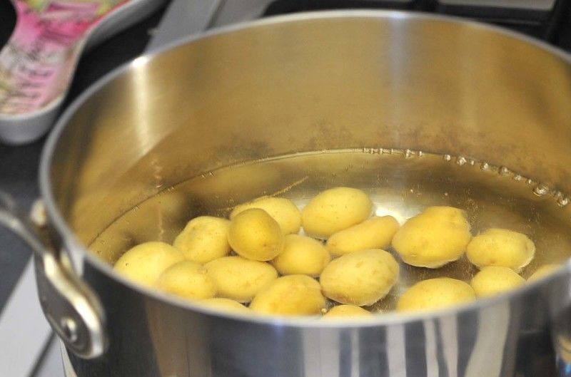 Las patatas son el elemento fundamental que da sentido a esta elaboración. Para conseguir las mejores patatas hay que hervir las patatas en agua caliente y añadir una pizca de sal para que empiece a coger sabor y las dejamos durante quince minutos o hasta que podamos atravesar las patatas con un palillo sin que oponga resistencia. Es importante retirar la piel de la patata, aunque la recomendación es que pelemos las patatas después de sacarlas porque la piel funciona como una capa protectora. Una vez que han pasado los 15 minutos las sacamos del agua y las secamos.