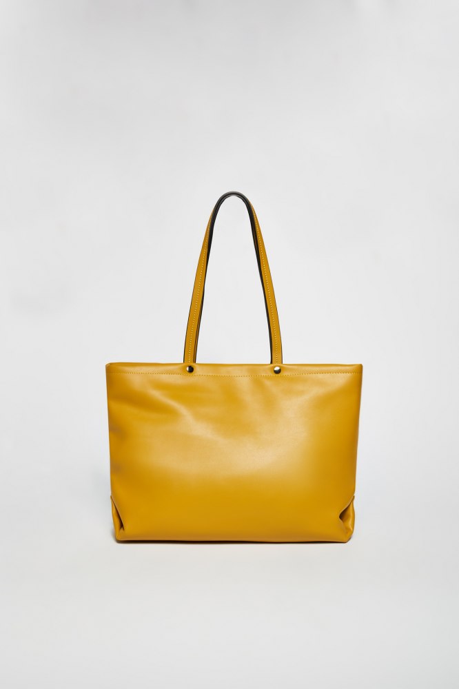 Diseño de asa doble rematadas con apliques metálicos. En un color a medio camino el mostaza y el dorado que le añadirá un toque alegre y dinámico a todos tus estilismos.