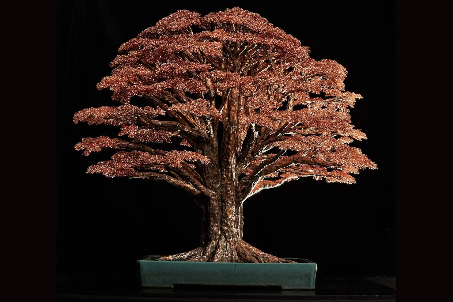 Utilizando cobre reciclado de instalaciones eléctricas y frigoríficas, y a través de una técnica propia patentada, el artista Javier Badiola ha creado un nuevo bonsái de cobre de gran formato y singular realismo, hecho a mano y forjado a golpes de martillo y puntos de soldadura. Así, este fiel exponente de la escultura moderna busca contar una historia distinta a la tradicional, representando los diferentes hábitats de la tierra de forma rupturista y de manera sostenible.