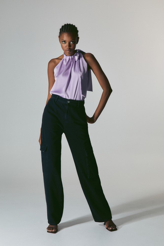 Aquí tienes un top que combina muy bien con la falda que acabamos de ver, pero también con faldas cortas y con pantalones. Una blusa con cuello halter rematada con nudo que queda en el lateral.