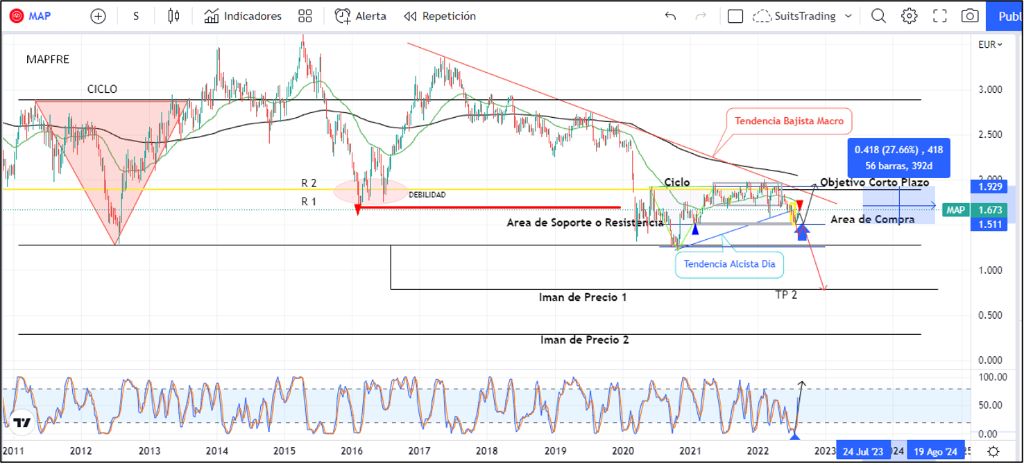 Gracias a la buena evolución del negocio, Mapfre suma una revalorización del 10% en las últimas 3 semanas, desde la realización de nuestro último artículo está desarrollando el movimiento alcista que, muy probablemente, puede frenarse bajo la directriz alcista de marco diario en inmediaciones de 1,7 euros, corresponde al mismo tiempo a una zona de resistencia registrada en julio y diciembre el año pasado y en abril de 2022.