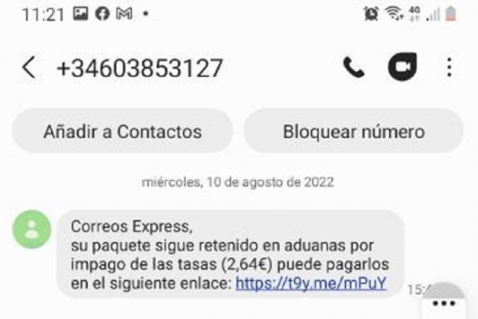 Está llegando a los teléfonos móviles un mensaje que dice así: “Correos Express. Su paquete sigue retenido en aduanas (2,64 euros). Puede pagarlos en el siguiente enlace…”.