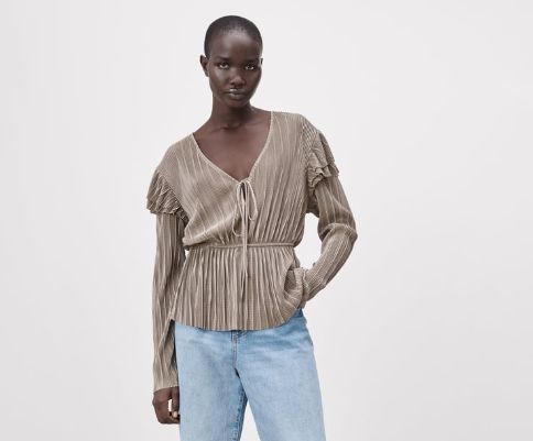 Otra de las mejores blusas que tiene Zara rebajada en su página web es esta fabulosa Blusa Plisada de Volantes visión. Es una blusa de escote pico que está ajustada con lazadas. Es de manga larga con detalles de volantes por los hombros, y con una cintura elástica. Su bajo acabado no tiene costura. Esta es otra de las opciones más económicas que tiene la empresa. Rebajado un 80%, su precio final se encuentra por 3,99 euros. Lo tienen en tres colores diferentes y en diferentes tallas. Además, también se encuentra dentro de la colección Join Life.