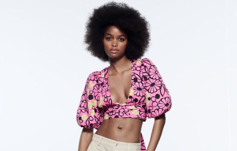 Esta es otra de las prendas de Zara que se hace en Marruecos, y es un cuerpo crop estampado precioso de escote pico y manga corta abullonada que acaba en un elástico interior. Tiene un bajo acabado drapeado, y un cierre en espalda con lazadas. También contribuye, como las otras dos prendas con Naciones Unidas gracias a su manera de trabajar y sus productos, y solo se encuentra en color fucsia. Está rebajado con un 76% y su precio final es de 5,99 euros. También disponible en tienda, dispone de diferentes tallas y tamaños para poder comprar en su página web.