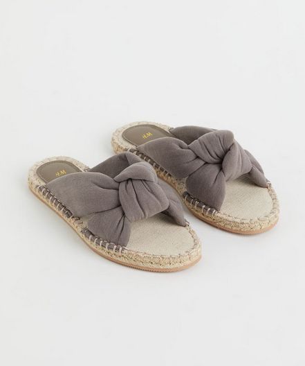 Estas sandalias de H&M son otra vuelta de tuerca del clásico diseño de alpargatas. Es un calzado tipo chancla con dos tiras de sarga entrelazadas en forma de nudo, y yute trenzado alrededor de la suela. Son planas, cómodas, con una altura de 1,7 cm, y cuatro colores disponibles: crema, estampado en beige claro, marrón oscuro y negro.