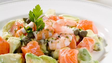 Otra ensalada que va a triunfar este verano es esta. Primero preparamos los aguacates. Debemos pelarlos y cortarlos en cuadrados para poder aliñarlos con un poco de zumo de limón. Seguidamente, metemos unas alcaparras y un poco de salsa rosa. Después preparamos las gambas y las cocemos en agua y sal para poder dejarlas enfriar lentamente. Juntamos todo, y le añadimos la salsa rosa. Las ventajas de esta ensalada nos la darán tanto el salmón como el aguacate, ya que ambos aportan muchas vitaminas y energía.