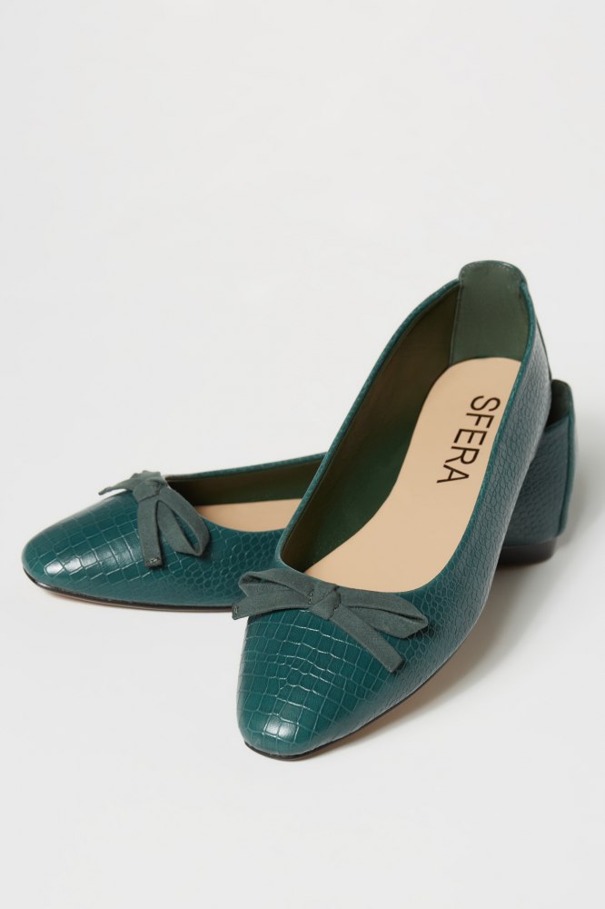 Una nueva versión de las clásicas bailarinas, en esta ocasión con un grabado que nos recuerda a la piel de cocodrilo. El zapato está rematado al estilo tradicional de este modelo, con un sencillo lazo en el mismo color.