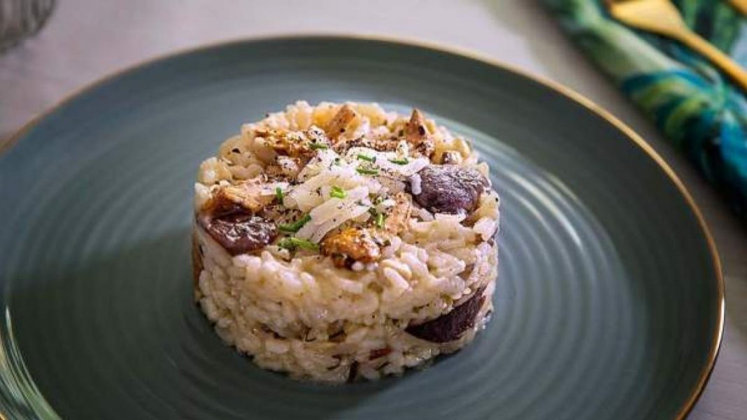 Antes de servir el risotto en el plato, hay que sazonar con sal, pimienta y perejil y mezclamos todo muy bien. Para emplatar, es tan sencillo como coger un plato llano o hondo y servir una generosa cantidad de este manjar, si quieres, puedes decorarlo con unas hojas de perejil fresco, unas setas que nos hayan sobrado y un poquito de crema agria como cereza del pastel. Para los que nunca sacian su hambre, se puede acompañar con un trozo de pescado, un filete de carne o un poco de pollo rebozado que le dará un toque crujiente al plato.
