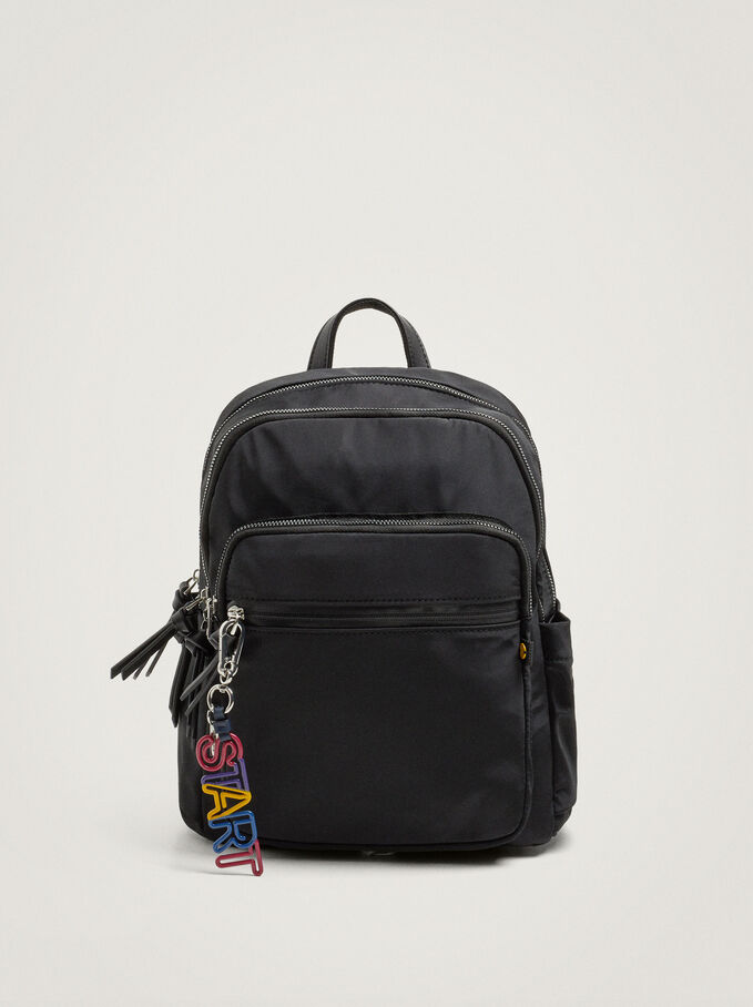 Otra de las opciones de Parfois, dentro de la categoría de las mochilas, es esta mochila de nylon con colgante que, a diferencia de la anterior, es más juvenil. Podemos comprarla en la página web y en sus establecimiento al módico precio de 25,99 euros y está disponible en los siguiente colores: negro, crudo, caqui, azul marino y naranja. Si hablamos de sus prestaciones, tiene unas asas de hombro que se pueden ajustar a tu gusto, dos bolsillo delanteros con cierre de cremallera, otros dos bolsillo laterales para llevar la botella de agua y un colgante extraíble que le da un toque moderno a la pieza.
