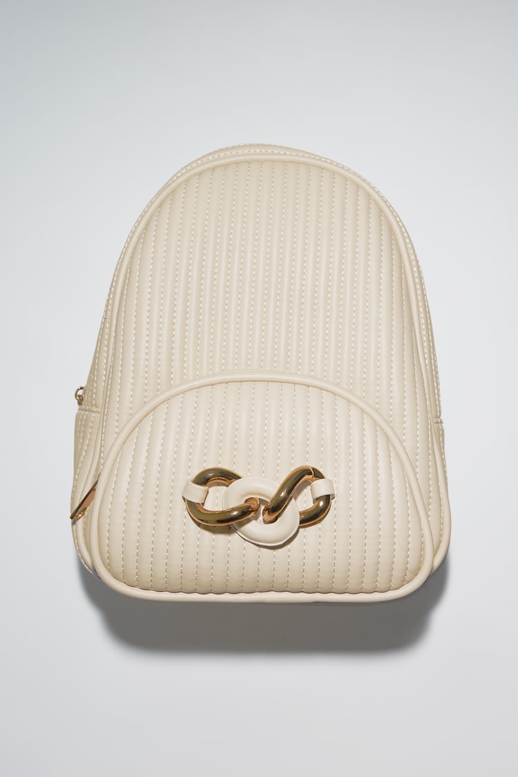 Se trata de una pequeña mochila con dos bolsillos con cierre mediante cremallera e interior forrado. Con asas de hombro ajustables y también con asa de mano en forma de cadena. Rematada con unos bonitos eslabones.