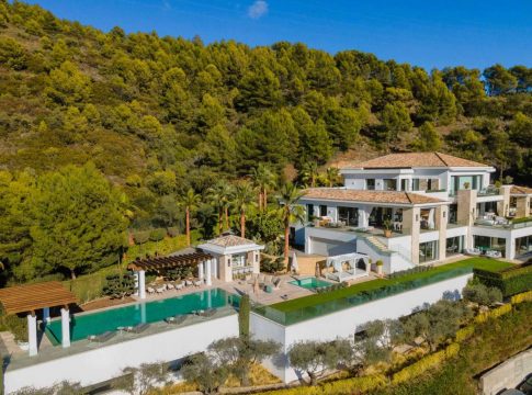 El interior de esta espectacular mansión deja sin aliento. Distribuida en tres niveles, la villa cuenta con elegantes salones, spa, piscinas cubiertas y al aire libre, cine, gimnasio y más de 300 m² de plaza de garaje. Siete amplios dormitorios “in suite” y un apartamento de servicio con dos dormitorios con baño también forman parte de la propiedad. Estos ofrecen vistas panorámicas de Marbella y el Mediterráneo hasta Gibraltar y la costa del norte de África. Cada habitación es como un hotel de lujo, con su propio minibar, con Nespresso o nevera, entre otros detalles y servicios.