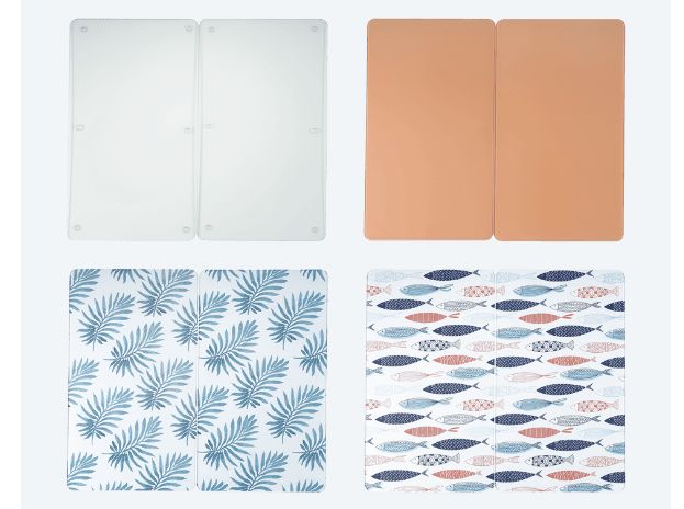 Y de manteles protectores para comer a protector de cocinas para colocar encima tablas de cortar y que así no se dañe la encimera o, peor aún, el mueble de cocina al ser más susceptible de ello. Tienes también en Aldi diferentes modelos como ves con diseños para todos los gustos. Que sepas que la oferta es de dos y no de los cuatro, con lo que te sale el pack a 9,99 euros, es decir, menos de 5 euros cada uno. Son de 30 x 52 cm, de vidrio y por tanto es un 2 en 1, es decir, se puede usar como propia tabla de cortar pero también para servir o cubrir placas de cocina.