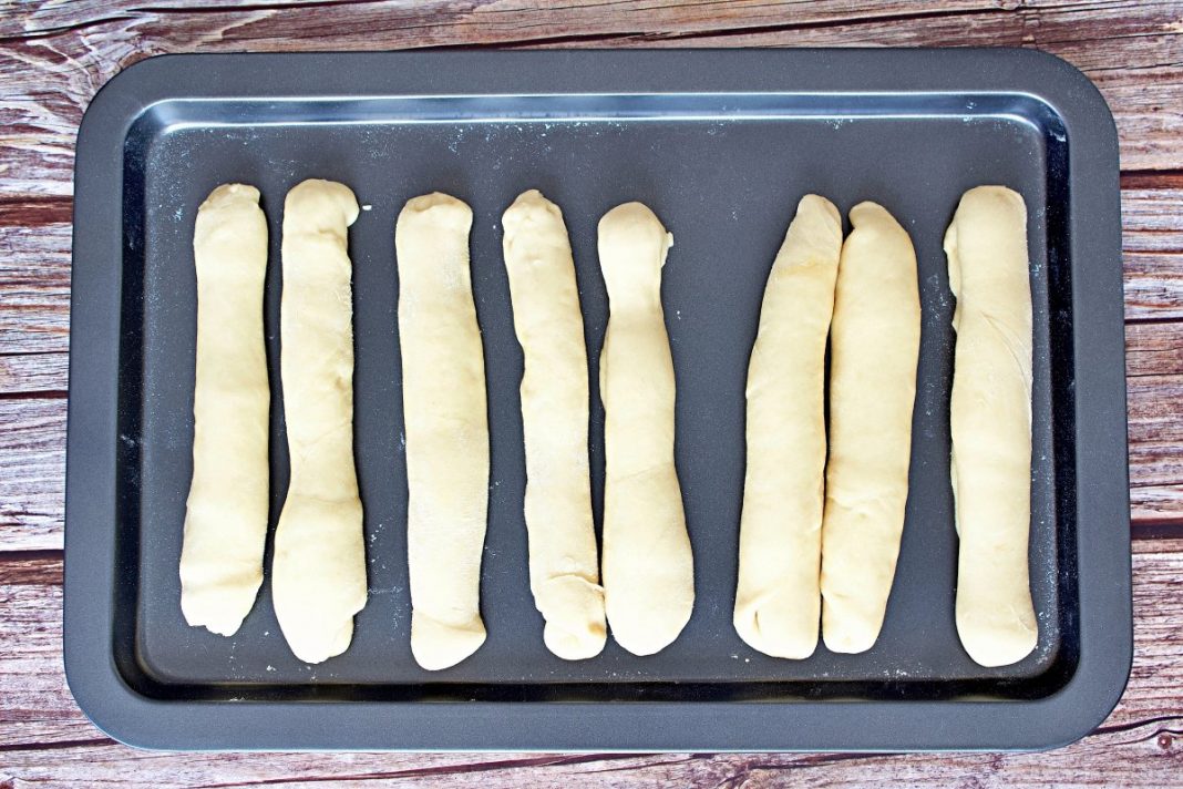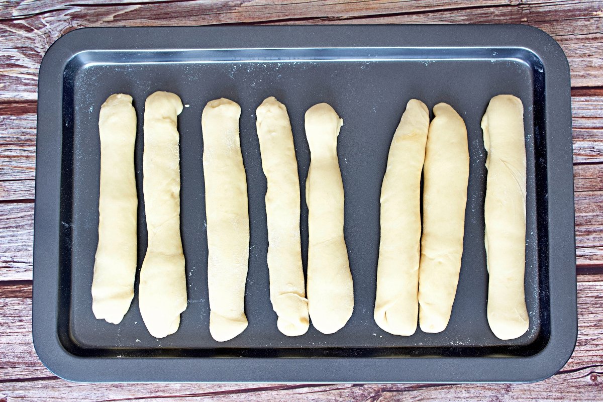 Una vez que haya crecido la masa, es el momento de darle forma y empezar a formar nuestros fartons. Para ello separamos la masa en porciones de unos 25 g. Con un rodillo la vamos estirando hasta formar un rectángulo y después lo enrrollamos sobre si mismo. Vamos disponiendo nuestros fartons en una bandeja de horno forrada con papel de hornear para que no se peguen. Llevamos la bandeja al horno precalentado a 180ºC con calor arriba y abajo. Solamente hay que hornearlos durante 7 minutos, hasta que tomen su característico color dorado. Retiramos del horno y dejamos que enfríen.