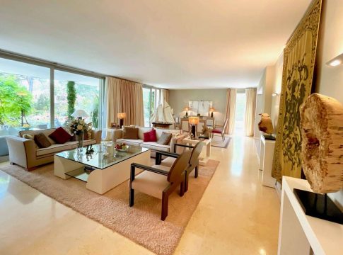 A la planta superior se sube a través de una escalera que conduce a un luminoso salón con chimenea que conecta con una de las terrazas con vistas al jardín. A la otra terraza se accede a través del dormitorio principal. La vivienda tiene cuatro dormitorios dobles con baño completamente equipados.