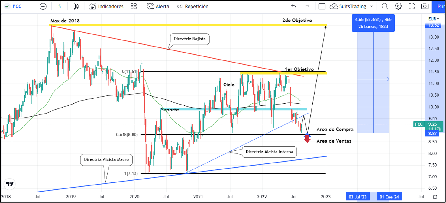 El movimiento alcista de las acciones de FCC estaría soportado por la estructura fundamental-financiera de largo plazo. Los resultados que la compañía presentó al finalizar julio arrojaron un incremento en las ventas del 13,1% mientras el resultado bruto de explotación (Ebitda) subió el 14% frente al mismo periodo del año anterior. Adicional a esto, aunque el resultado neto atribuible descendió un 2,5% relacionado al aumento de los resultados atribuibles a socios minoritarios, la compañía presentó una cartera de ingresos de más de 38.000 millones de euros que corresponde a un incremento del 25,8% en comparación al cierre de 2021, evolución que entidades como Bankinter ven con agrado, por lo cual recomiendan comprar acciones de FCC con un precio objetivo de 13,5 euros, mismo objetivo que nosotros tenemos trazado a largo plazo y que corresponde a los máximos registrados en 2018.