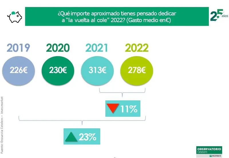 Las cifras de intención de gasto suponen, no obstante, un incremento del 23% respecto a la última cifra pre-pandemia, la del 2019, que situaba el gasto medio de los españoles en ‘la vuelta al cole’ en 226 euros.