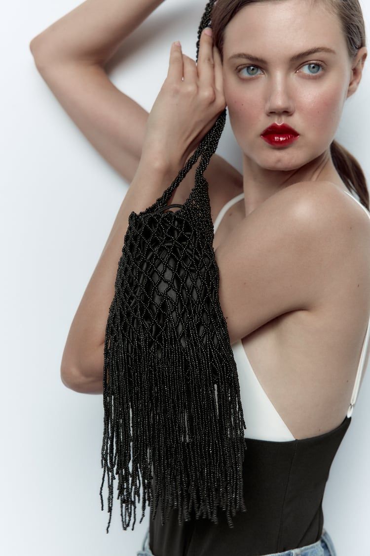 Entre los complementos no puede faltar un bolso y ya hablando de fiesta, qué mejor que este bolso para complementar un atuendo de lujo. Es un bolso con abalorios y saquito interior de tejido, con cierre mediante frunce. Se vende en negro y como ves es pura elegancia, pensando ya incluso en llevarlo para el aún lejano fin de año. Ya sabes que de todas formas hay también una buena variedad de bolsos para el día a día. Este tiene un precio en Zara de 25,95 euros.