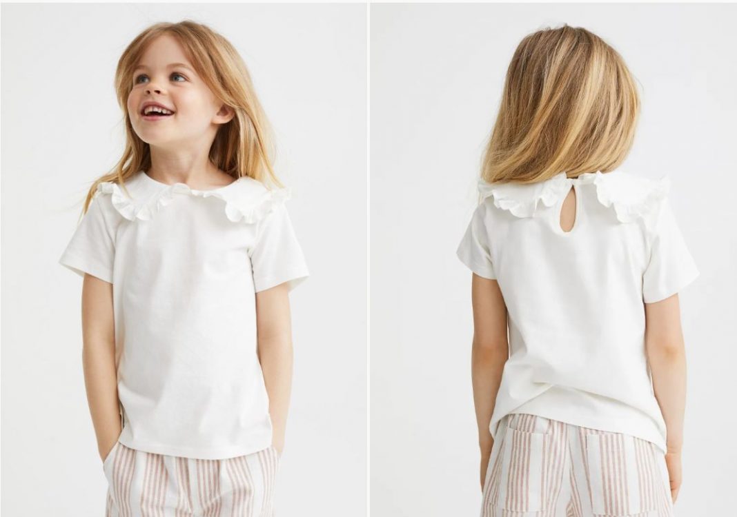 Comenzamos con una camiseta para que tu niña vaya bien cómoda y pensada más bien para las primeras semanas de colegio, con un clima aún veraniego o al menos de buen tiempo. Es una camiseta con cuello en punto suave de algodón, con cuello redondo con ribete de volantes y cierre de lágrima con botón en la nuca. Una prenda sencilla pero preciosa que también le gustará a tu hija, y que se puede elegir entre el color blanco o amarillo. Su precio es de 7,99 euros.