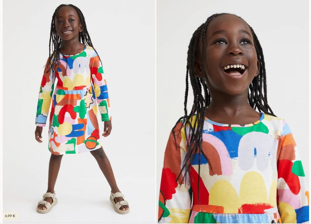 Y tanto que lo es, pero no imaginas viéndolo lo barato que lo tienes en H&M: solo 6,99 euros. Si, por este precio tienes este maravilloso vestido que encandilará a tu hija y con la que triunfará en el cole o de paseo con nosotros. Es alegre, cómodo, pero aparte del de la foto tienes para elegir otros seis estampados y colores, nada menos. Por este precio seguro que te harás con más de uno modelo o quizá todos. Son de manga larga con cuello redondo, costura fruncida en la cintura y falda con vuelo.