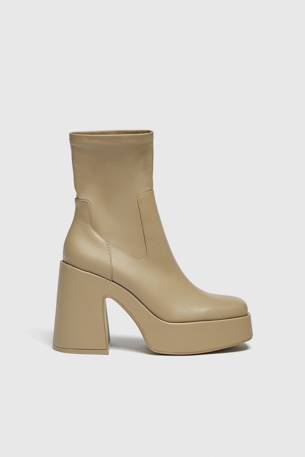 La hermana pequeña del modelo anterior. Hay chicas que no se sienten cómodas con una caña tan alta, además de que solo se puede utilizar con pantalones cortos o con una falda. Por ello, Pull&Bear tiene este botín plataforma stretch que es un calzado que podemos utilizar más de diario, aunque están pensadas para salir de fiestas. Un tacón de 11 centímetros, el modelo que más tacón tiene, una caña que cubre el tobillo, un corte ceñido al pie, un estilo calcetín, disponible en color negro y taupe y un precio muy económico de 39,99 euros.