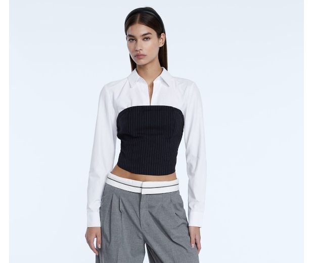 Vamos con una camisa, que como ves es perfecta ya para la nueva temporada, para el entretiempo. Es una camisa con cuello solapa y escote pico de manga larga. Tiene detalle de corset sin tirantes y la tienes disponible en Stradivarius en tallas XS a XL. Como ves es elegante pero sencilla y con un diseño muy original, con esa mezcla de camisa y corset. La tienes por 19,99 euros y una vez más es perfecta tanto para un día laboral como para una ocasión especial. Encaja con todo.