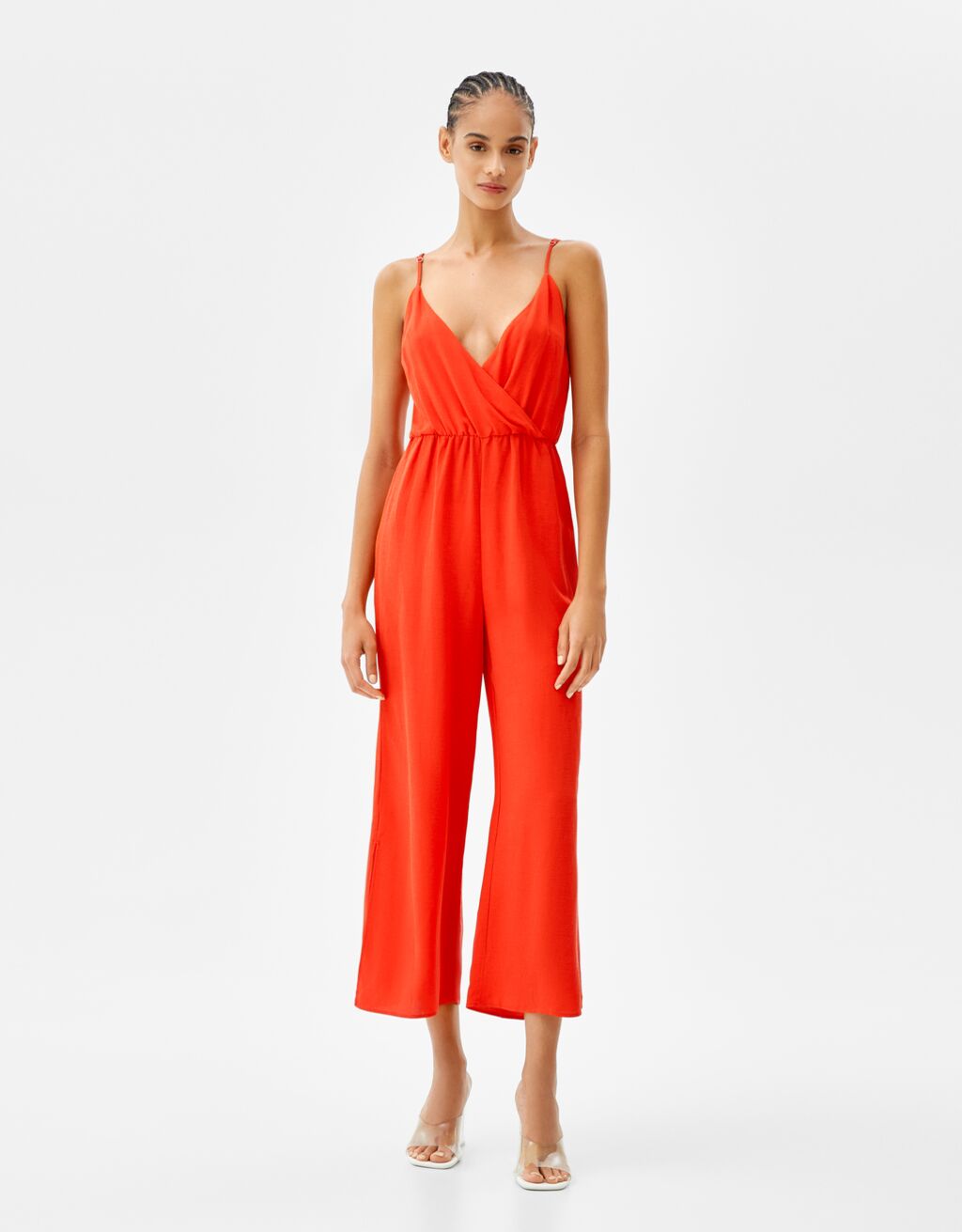 Mono de escote cruzado en forma de V, con tirante regulables en altura. Confeccionado con lino, para hacerlo más ligero y fresco, y rematado con una parte inferior de tipo culotte que queda por encima de los tobillos.