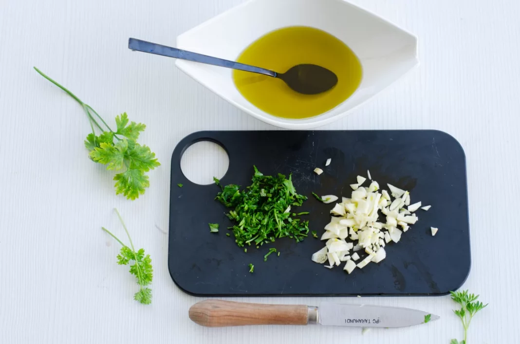 Para preparar esta receta, lo primero que haremos es pedir en la pescadería que nos preparen dos buenos filetes de la mejor dorada que tengas. Luego, cuando tengamos esto, cogeremos un cuchillo y picaremos cuatro dientes de ajo y cuatro ramas de perejil bien finitas y acto seguido, lo pondremos todo en un bol con 30 ml de aceite.