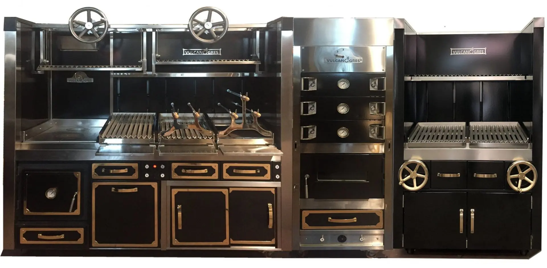 Las Barbacoas profesionales Vulcano Gres, con sus diseños retro, bronces y acero,  fusionan la tradición de la cocina de carbón con lo último en tecnología hostelera, para conseguir los mejores resultados y sorprender al cliente en parrillas vistas con la belleza de sus hechuras.