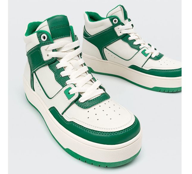 Y si las anteriores te recuerda al calzado deportivo, estas más bien a las botas de baloncesto, pero tampoco están pensadas para ello sino para vestir casual y, eso sí, son perfectas para combinar con atuendo deportivo. Las tienes en verde y negro, con detalle de piezas, pespuntes y perforados, de una belleza, equilibro y elegancia, aunque no esté pensada para ocasiones especiales sino para el día a día. Pero tienen fuera, personalidad y son cómodas. Su precio es de 29,99 euros.