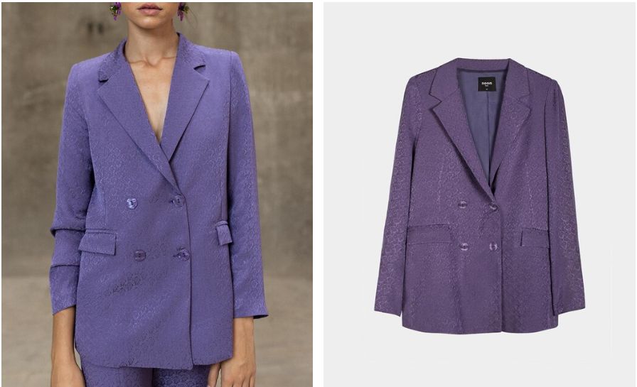 Y si te has fijado bien en la foto, verá que el blazer de la parte superior encaja también con el pantalón que parece todo uno. Pues no es así pero sin duda invita a comprar el conjunto como un todo. Se trata de un blazer cruzado con doble botonadura y en el mismo tono y color que los pantalones anteriores, con lo que claramente Noon expone su intención. Es de cuello solapa y manga larga, con bolsillos con solapas y cierre frontal con botones. El precio es de 99 euros.