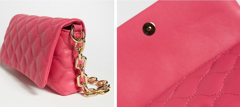 El último producto de nuestra lista, pero no el menos importante, es la bandolera de color fucsia. A diferencia de las demás, su diseño marca un estilo totalmente único e irrepetible. Tiene ondas que forma la costura sobre el tejido acolchado. Además, posee un asa de cadena dorada y se cierra mediante una solapa que tiene un botón de presión en el medio. Su precio es de 13,99 euros.