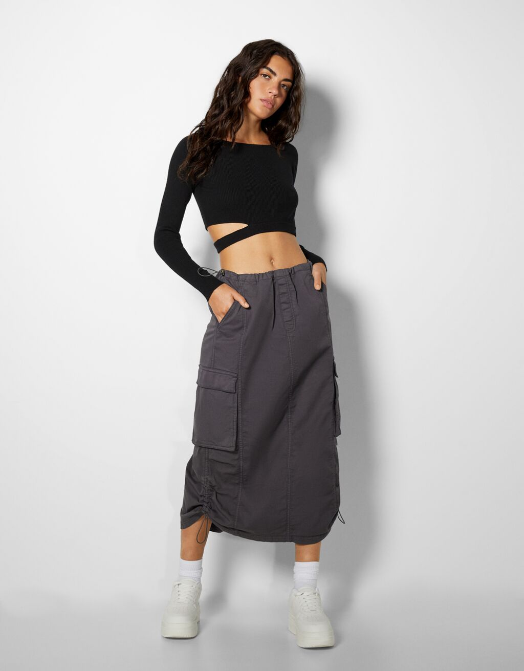 Si te ha gustado el estilo parachute del pantalón anterior, en Bershka tienes faldas inspiradas en el mismo. Como este diseño de corte midi con un original bolsillo grande en el lateral y dos bolsillos laterales.