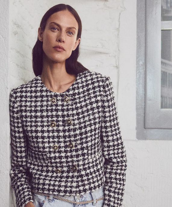 Nos encanta esta chaqueta que hemos visto en el catálogo de Mango. Y nos encanta por muchos motivos, pero sobre todo porque tiene un tejido tweed que genera un contraste muy bonito con los botones que tiene que imitan a una joya. Además, sale muy bien de precio. Tan solo cuesta 59’99 euros.