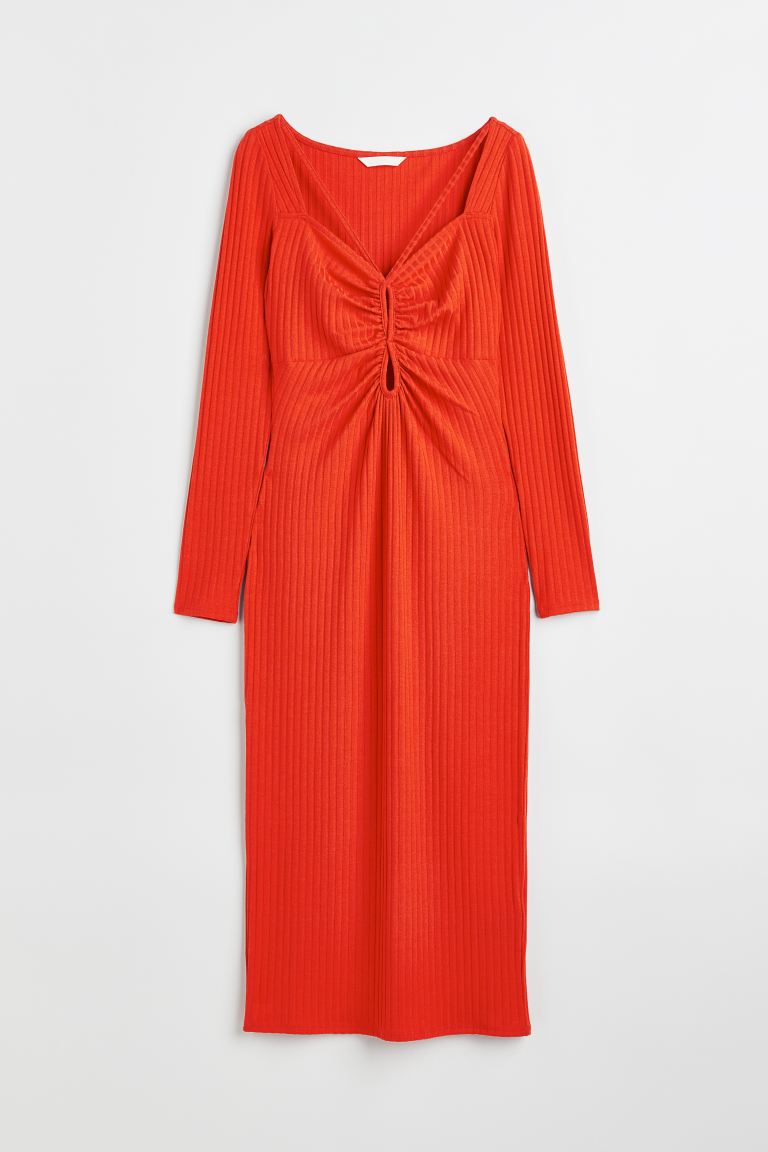 Las prendas cut-out están en máxima tendencia y de cara al otoño van a seguir teniendo su protagonismo. En la nueva colección de H&M hay varias propuestas de este estilo, como este precioso vestido de canalé, de corte entallado y con un bonito escote corazón. En la parte de delante, en el mismo escote tiene secciones cut-out con finas tiras que se sujetan anudadas en la nuca. El vestido es de manga larga, y lleva un elástico fruncido que le da un efecto drapeado en la parte delantera. Se trata de un diseño muy original y llamativo para lucir en una cita especia. Está disponible en color rojo vivo y en negro, por solo 19,99€.